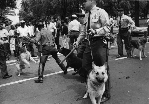 Police dogs set upon a man during an anti-segregation demonstration in Birmingham, Alabama, 1963. Accessed via, Reuther Library.